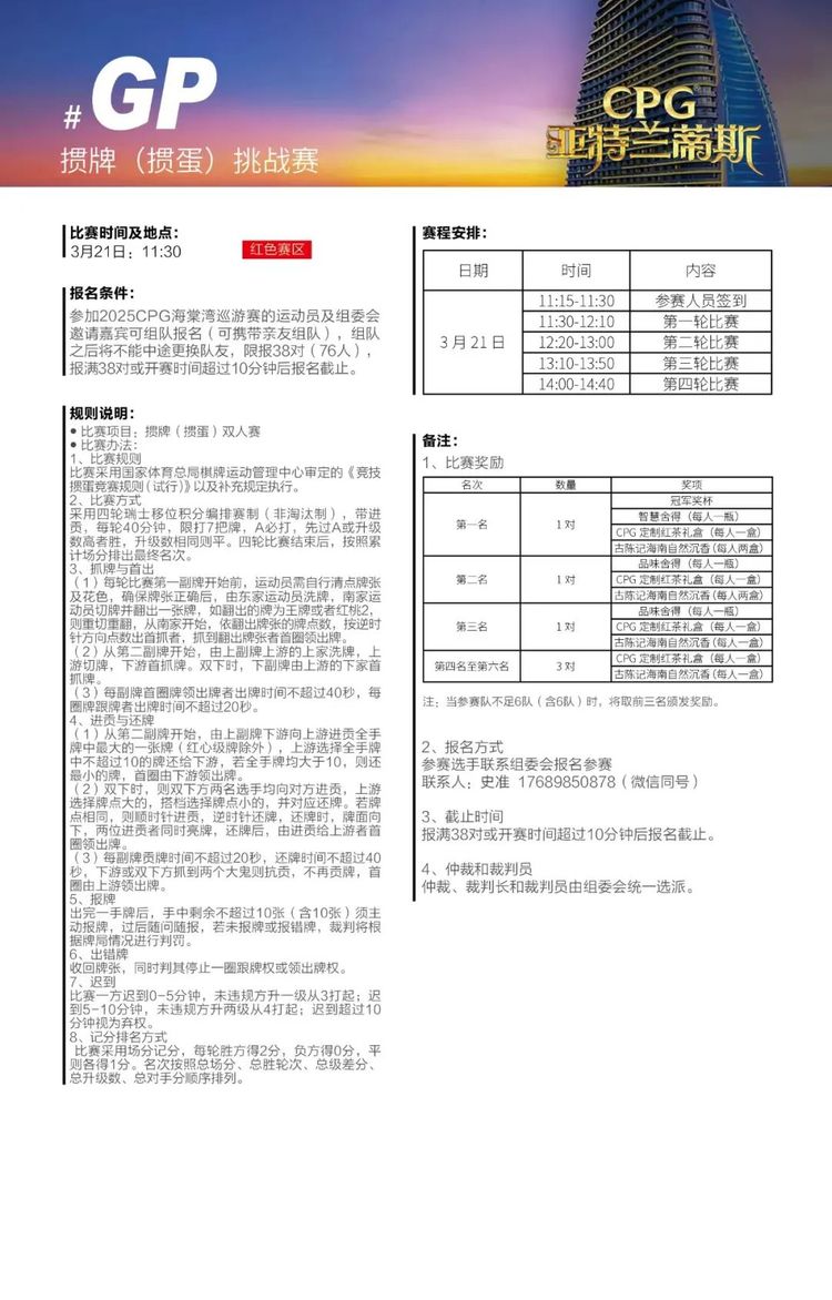 为贯彻落实全民健身计划,丰富群众文化体育生活,推动竞技掼蛋项目的普及,2025CPG®海棠湾巡游赛期间将在红色赛区举办掼牌(掼蛋)挑战赛。